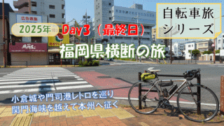 福岡県横断の自転車旅の3日目(最終日)は、北九州市から関門トンネルを通過して本州へ向かいます。その道中では、TOTOミュージアムや小倉城、門司港レトロ、和布刈神社を訪れる予定ですね。晴天が続く旅路に気分も最高潮!何が起こるのか乞うご期待。